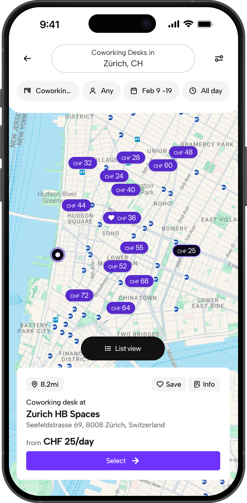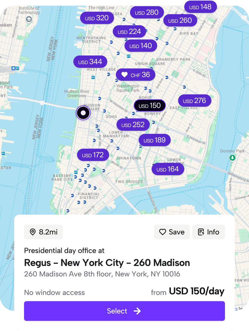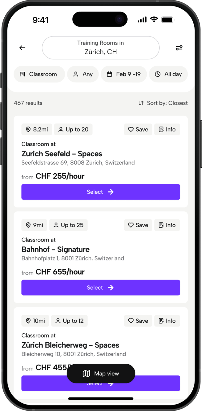 Offices, meeting rooms, coworking desks, and training rooms — save your favorites for one-tap access, or discover new spaces nearby.