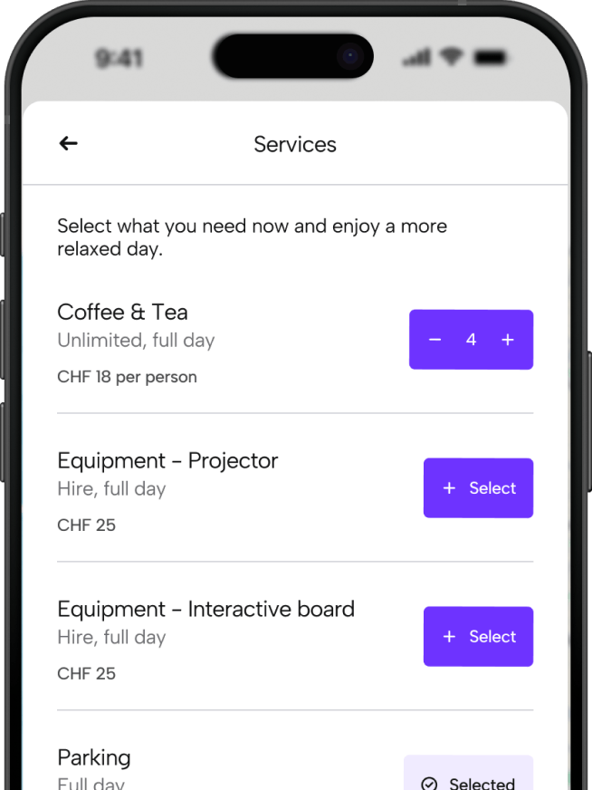 Add services before you arrive - coffee, parking, equipment - so your workspace is ready when you are. Plan ahead. Walk in prepared.
