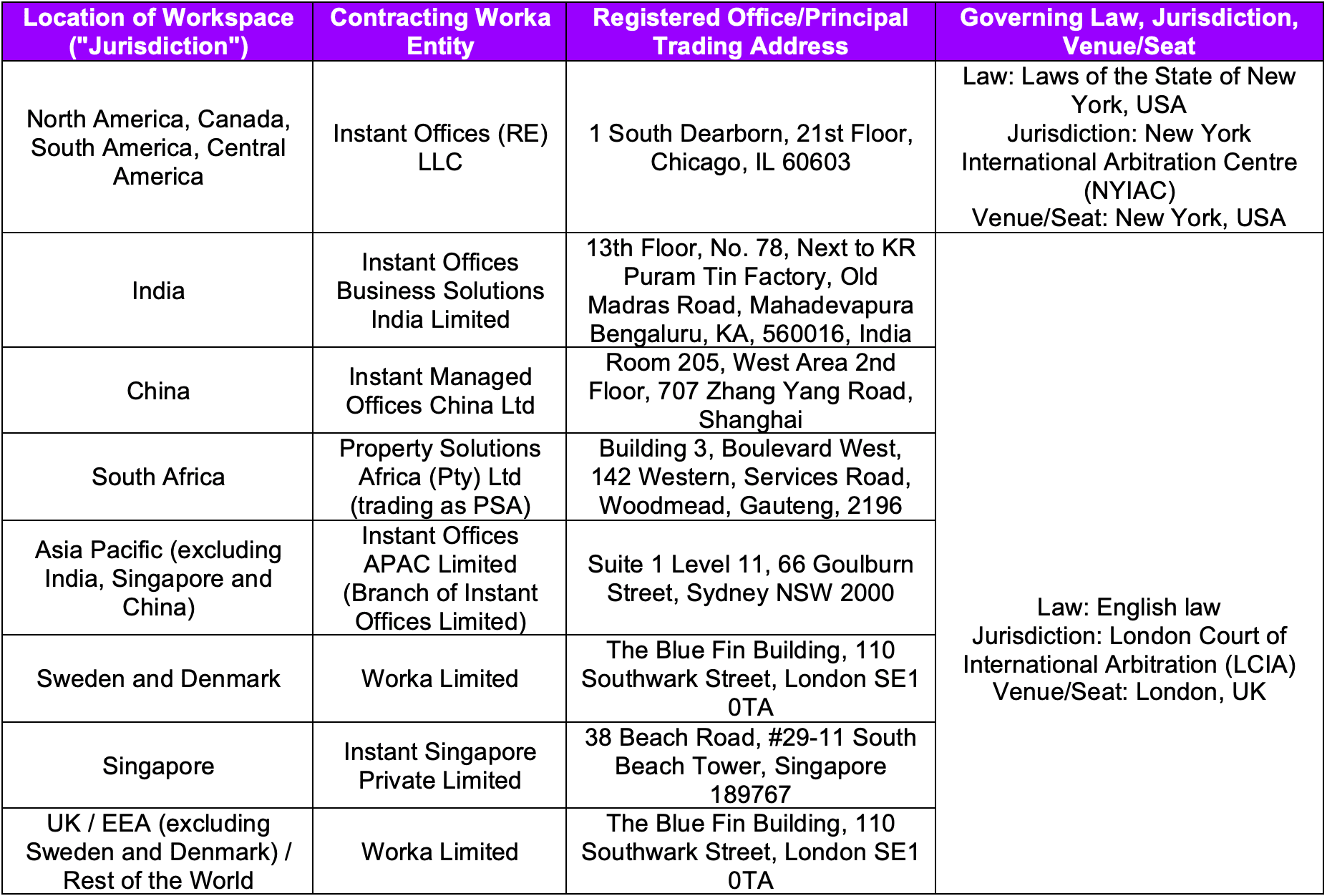 1. If You are using the Platform to submit an Enquiry or Booking Request, the Worka entity that is the contracting party to these Terms (applicable to such Enquiry or Booking Request and any resulting Workspace Agreement or Workspace Booking as applicable) is determined as below based on the location of the Workspace that is the subject of Your Enquiry or Booking Request, save as otherwise expressly stated in paragraph 2: