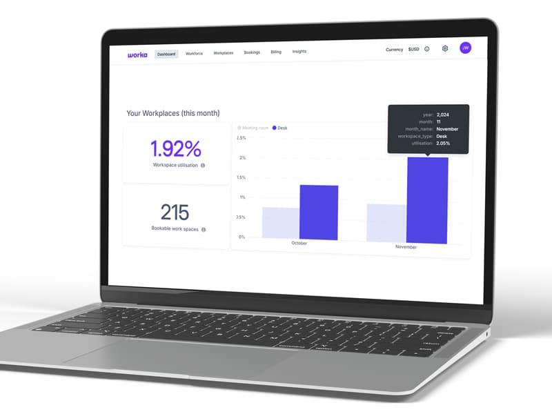 Worka Team provides a number of different reports around the utilisation of workspaces. These reports typically present a utilisation rate expressed as a percentage, which reflects the total booked space as a proportion of the total bookable space. These reports make allowance for periods when individual workspaces are not bookable during the reporting period.